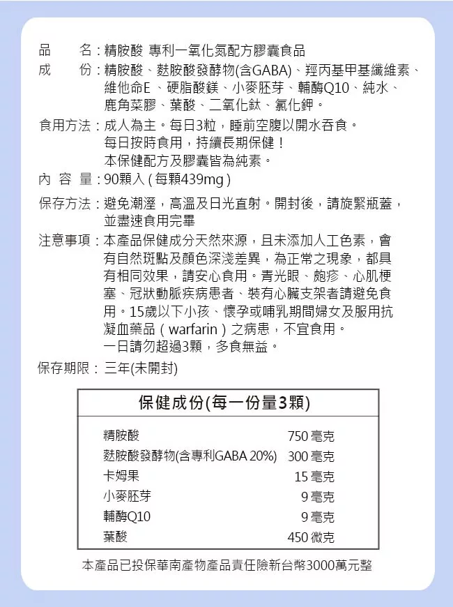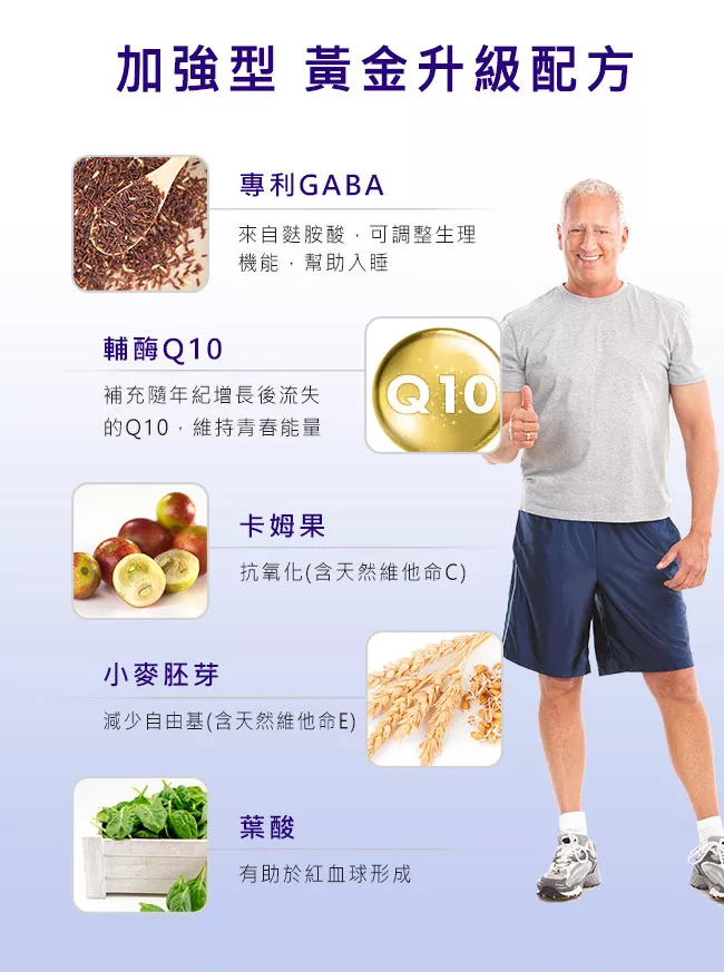 加強型一氧化氮,黃金升級配方,添加專利GABA、卡姆果、COQ10、小麥胚芽、葉酸,可幫助調整生理機能,幫助入睡!